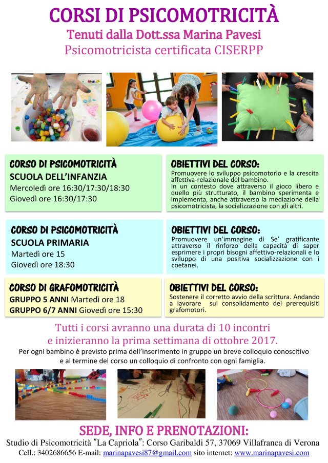 In locandina tutti i percorsi attivi per l’a.s. 2018/2019 presso “La Capriola” Studio di Psicomotricità.